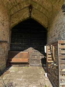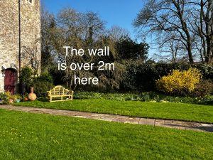 The lowest gate in the garden is 1.37m (4’6″), though most of the garden has a wall that is over 2 metres high. See the photos below. The Dog Waste bin is on the ground floor of the Welsh Gatehouse. NB Deliveries for Courtyard House (our home at the other end of the garden) come in through a completely different entrance, at the back of the house.